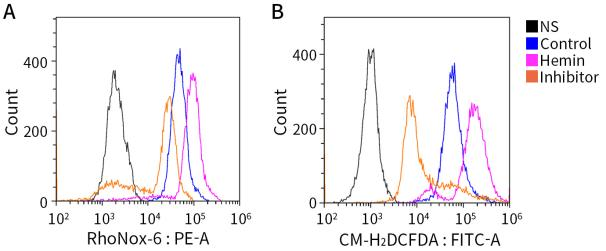 图2.碧云天铁死亡荧光检测试剂盒(RhoNox-6/CM-H2DCFDA)(C1190)用于流式检测的效果图。图A为亚铁离子的荧光信号,图B为ROS的荧光信号。
