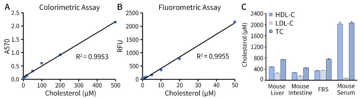 图1.碧云天Amplex Red高密度与低密度脂蛋白胆固醇检测试剂盒(S0213)对胆固醇标准品和不同样品的检测效果。图A和图B为本试剂盒对胆固醇标准曲线的检测效果图,图A为吸光度检测,图B为荧光检测,图C为本试剂盒对不同样本的HDL-C、LDL-C和总胆固醇(Total Cholesterol, TC)的检测效果图。