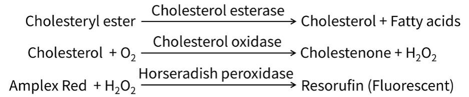 Amplex Red能与H2O2 1:1反应,产生强烈的红色荧光物质试卤灵(Resorufin),通过检测试卤灵的荧光强度或者吸光度即可检测高密度或低/极低密度脂蛋白胆固醇的含量。原理图如下: