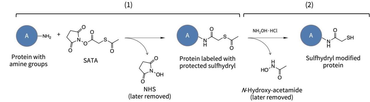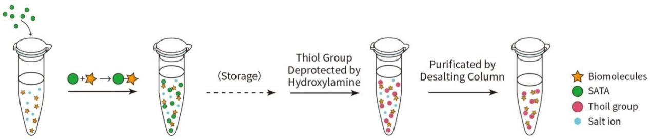 图1.Sulfhydryl快速标记试剂盒(P1293)进行蛋白氨基的基于SATA的巯基标记反应原理