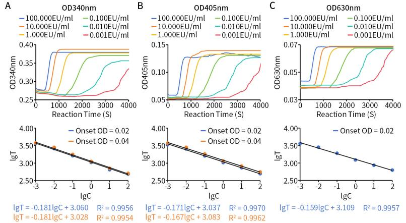 图1.碧云天高灵敏度内毒素检测试剂盒(鲎试剂动态浊度法)(C0272)检测效果图。图A为在340nm波长条件下进行吸光度连续动态检测的效果及所绘制的标准曲线(启动OD分别设为0.02和0.04);图B为在405nm波长条件下进行吸光度连续动态检测的效果及所绘制的标准曲线(启动OD分别设为0.02和0.04);图C为在630nm波长条件下进行吸光度连续动态检测的效果及所绘制的标准曲线(启动OD设为0.02)。
