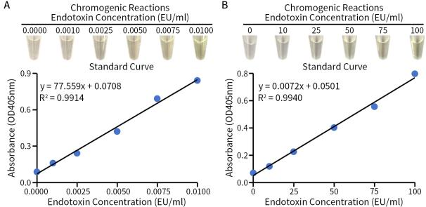 图2.碧云天高灵敏度内毒素检测试剂盒(鲎试剂一步显色法)(C0275)检测标准曲线的效果图。取配制好的下列浓度的内毒素标准品溶液:0.0000、0.0010、0.0025、0.0050、0.0075、0.0100EU/ml (图A)及0、10、25、50、75、100EU/ml (图B)各20μl,用本试剂盒进行显色反应及标准曲线的检测。