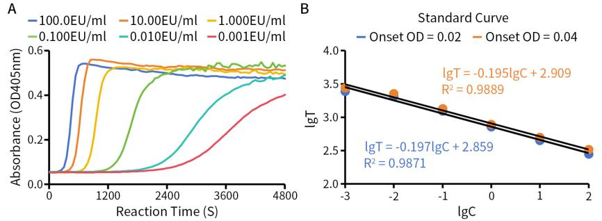 图3.碧云天高灵敏度内毒素检测试剂盒(鲎试剂动态显色法)(C0277)检测效果图。图A为在405nm波长条件下进行吸光度连续动态检测的效果;图B为所绘制的标准曲线(启动OD分别设为0.02和0.04),其中样品内毒素浓度为C,孵育反应时间为T,标准曲线由lgT和lgC拟合绘制而成。