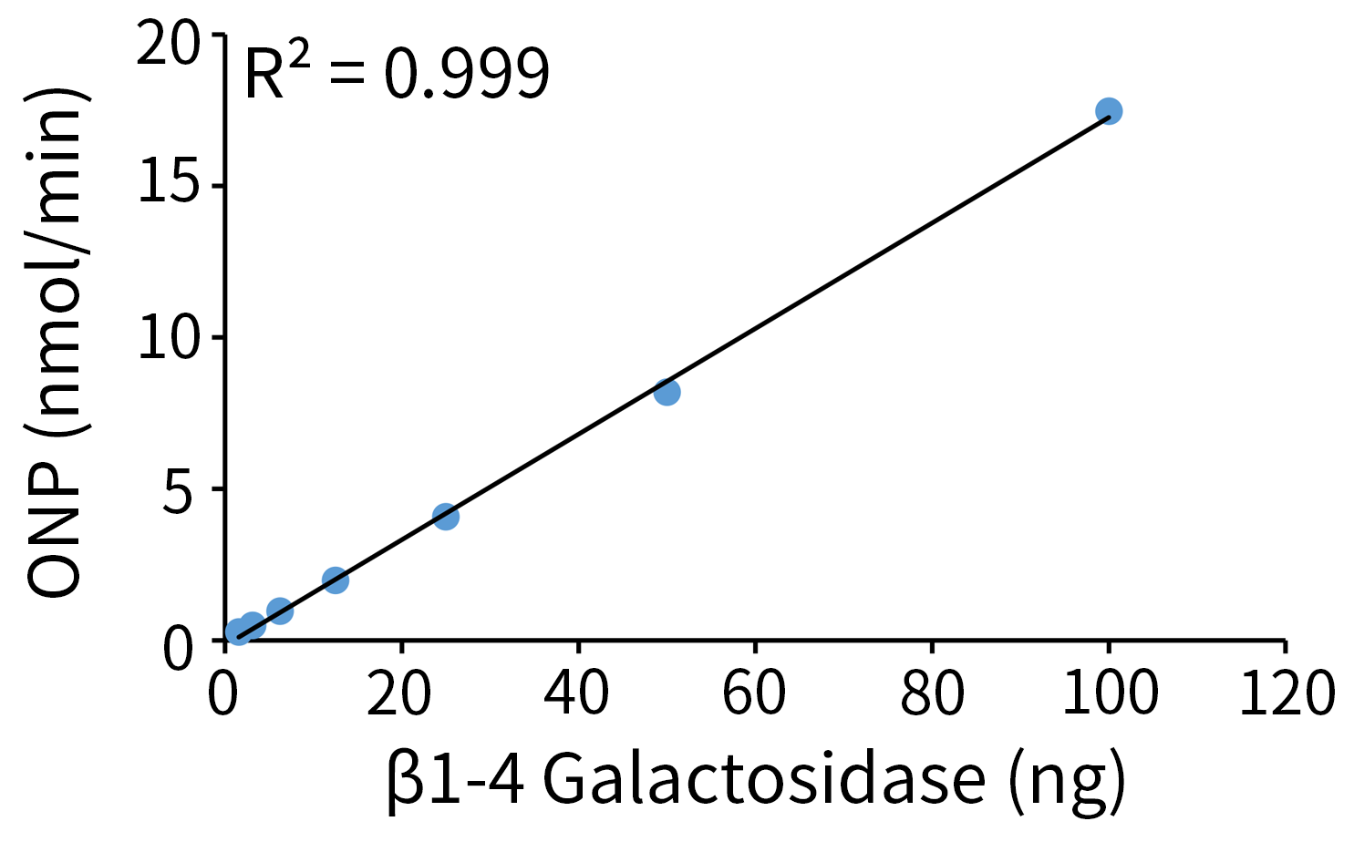 图1.碧云天β1-4半乳糖苷酶(β1-4 Galactosidase) (P2345)的酶活性检测效果图。X轴为β1-4 Galactosidase蛋白的质量(ng),Y轴为对应单位时间内ONPG水解产生的ONP (nmol/min)。