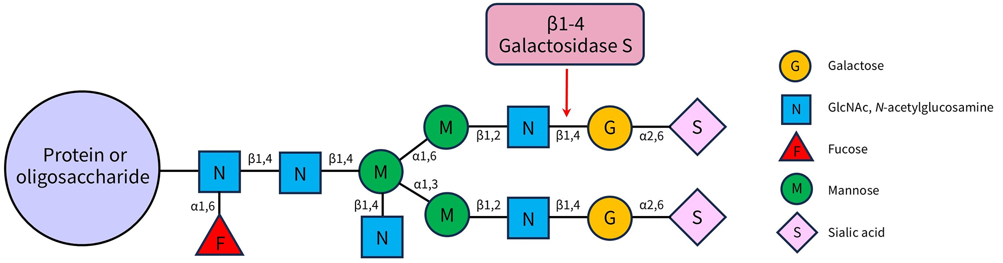 图2. 碧云天β1-4半乳糖苷酶S (β1-4 Galactosidase S) (P2343)催化糖蛋白或寡糖中非还原性β1-4连接半乳糖水解的示意图