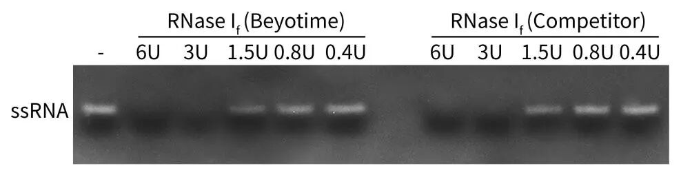 图1.碧云天RNase If (R7083)和N公司的同类产品(Competitor)降解ssRNA的效果图。