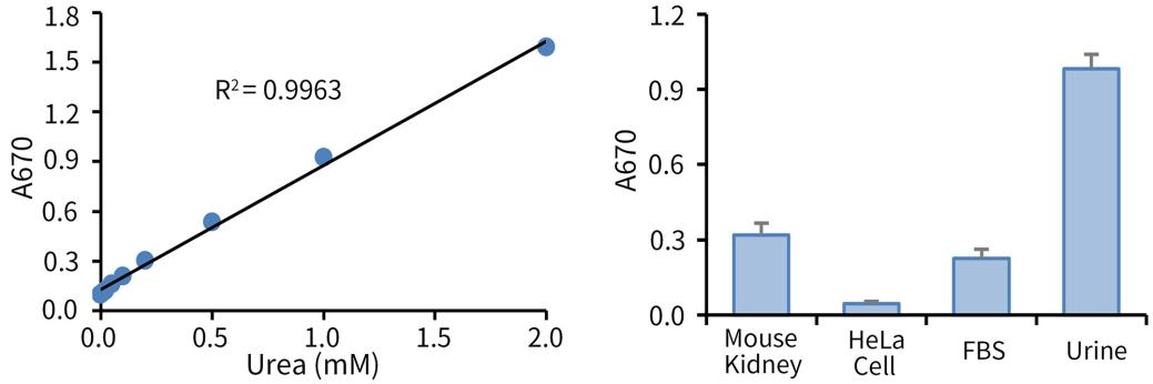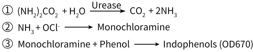 吲哚酚在670nm左右有最大吸收峰,吲哚酚的生成量与样品中尿素酶的活性成正比,这样通过670nm处的吸光度检测就可以非常灵敏地检测尿素含量以及尿素酶的酶活性。