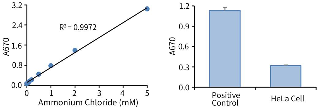 图3.碧云天尿素酶活性检测试剂盒(显色法)(S0577)对氯化铵标准品、阳性对照、HeLa细胞裂解液样品的检测效果图。上图为本试剂盒对氯化铵标准品的检测效果图,在0.05-5mM浓度范围内有良好的线性关系;下图为本试剂盒检测阳性对照(Positive Control)和7μg蛋白量的HeLa细胞裂解液样品(HeLa Cell)的信号值。
