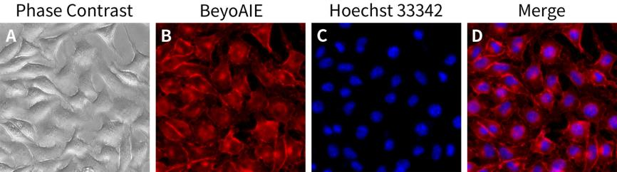 BeyoAIE™ Membrane Red Probe在进入细胞膜之前荧光信号非常弱,在与细胞膜结合前后由于聚集状态的变化其荧光强度会产生极为明显的变化。BeyoAIE™ Membrane Red Probe被激发后可以发出橙红色的荧光,与细胞膜脂质结合后的激发光谱和发射光谱参考图1。其中,最大激发波长为493nm,最大发射波长为610nm。