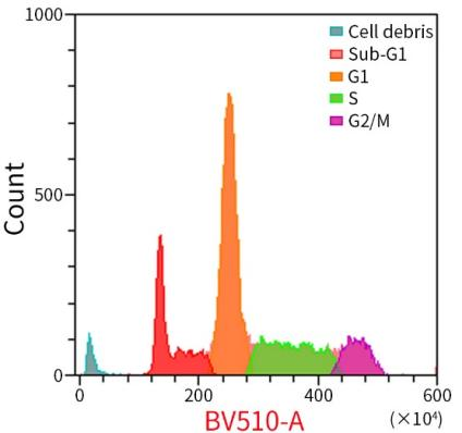 图1.碧云天BeyoAIE™ Nuclear Green细胞周期与细胞凋亡检测试剂盒(C2107)检测经凋亡诱导的Jurkat细胞的效果图。Jurkat细胞经适当凋亡诱导后,用70%乙醇固定,经本试剂盒染色后进行流式检测分析细胞周期和细胞凋亡。图中可见凋亡细胞的Sub-G1峰。流式细胞仪检测通道为BV510 (Ex/Em=405/525nm)。