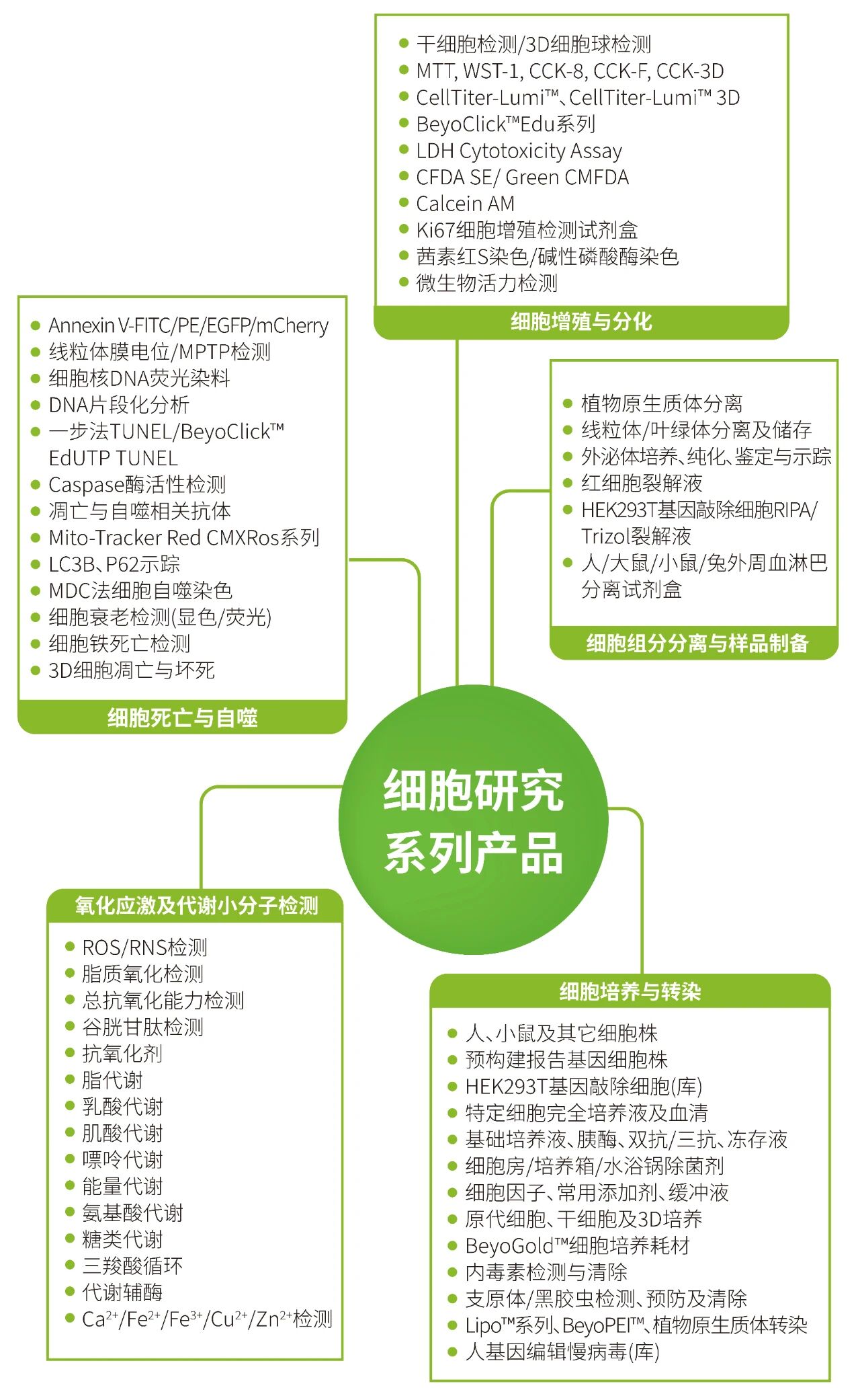 除了上述新品和配套试剂,碧云天在细胞分析与检测领域还有更多“宝藏”产品。下面这张思维导图帮你系统梳理了从细胞活力检测、细胞毒性分析、细胞标记等完整产品线,一图看懂如何根据实验需求快速匹配最合适的试剂或仪器。赶紧收藏,下次做CCK-8、AO/PI双染或组织活性检测时就不怕挑花眼啦~