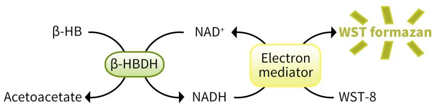在β-羟基丁酸脱氢酶(β-HBDH)的作用下,β-羟基丁酸(β-HB)被氧化生成乙酰乙酸(Acetoacetate),在这一反应过程中NAD+被还原为NADH;生成的NADH在电子耦合试剂(Electron mediator)的作用下将WST-8还原生成橙黄色的Formazan,在450nm左右有最大吸收峰。反应体系中Formazan的生成量与样品中β-羟基丁酸含量或者β-羟基丁酸脱氢酶的活性成正比。