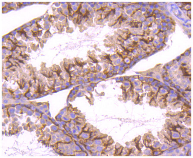 | Fig. 1. Western blot analysis of STIM1 on different lysates using anti-STIM1 antibody at 1/1,000 dilution. Positive control: Lane 1: K562; Lane 2: HepG2 | Fig. 2. Immunohistochemical analysis of paraffin-embedded mouse testis tissue using anti-STIM1 antibody. Counter stained with hematoxylin. |