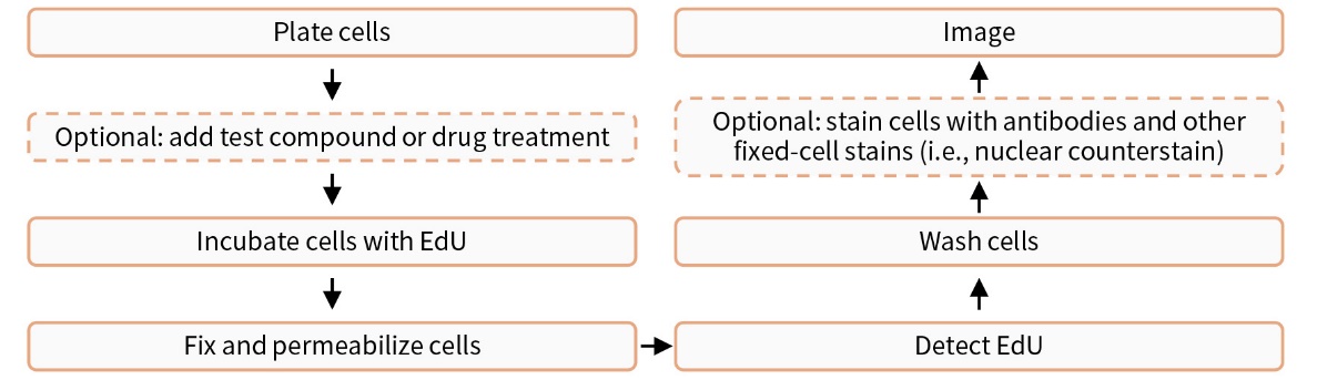 细胞增殖能力的检测是评估细胞活性、基因毒性和抗肿瘤药物效果等的基本方法。公认的最精确的检测细胞增殖的方法是直接检测细胞中DNA的合成。最初广泛使用的通过检测DNA合成来检测细胞增殖的方法是放射性标记核苷掺入法,如氚标记胸腺嘧啶脱氧核苷([3H]thymidine)掺入法。但该方法由于有放射性污染并且很难实现单细胞检测而受到很大的限制,随后逐渐被基于抗体检测的BrdU(bromo-deoxyuridine)法所替代。BrdU法步骤繁多,且需要使用BrdU抗体,影响因素较多,稳定性比较差。并且由于BrdU法需要使用抗体,有时会和其它目的蛋白基于抗体的检测相互产生干扰。EdU法基于EdU掺入和后续的点击反应,无需使用抗体、操作便捷、检测灵敏度高,是一种在BrdU法基础上升级换代的新方法,将会逐步取代BrdU法。