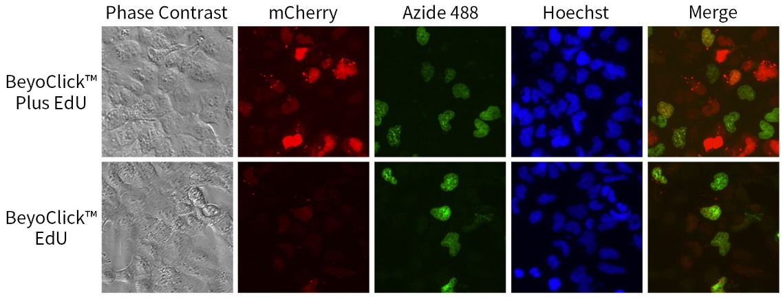 图4. 碧云天BeyoClick™ Plus EdU-488细胞增殖检测试剂盒(C0072)和BeyoClick™ EdU-488细胞增殖检测试剂盒(C0071)用于HEK293细胞增殖检测的效果图。HEK293细胞转染pCMV-Cre-mCherry质粒(D2607)后显示红色荧光,加入EdU孵育2小时后被Azide 488标记显示绿色荧光,细胞核进行Hoechst 33342复染后显色蓝色荧光。BeyoClick™ Plus EdU组中的mCherry红色荧光和Azide 488绿色荧光都比较明亮,而BeyoClick™ EdU组中mCherry红色荧光明显变弱。实测数据可能会因细胞类型、转入的荧光蛋白、检测仪器等的不同而存在差异,图中数据仅供参考。