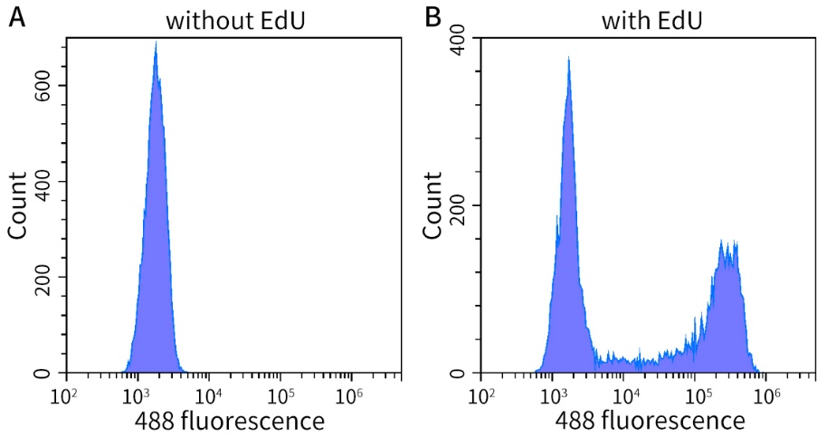 图5. Jurkat细胞使用本试剂盒标记后用流式细胞仪检测细胞增殖的效果图。Jurkat细胞无EdU标记(图A)或EdU标记(图B),2小时后用本试剂盒进行点击反应,然后使用流式细胞仪进行检测。从图中可以看出,无EdU标记组中无绿色荧光阳性的细胞,而EdU标记的细胞有较高比例的绿色荧光(488 fluorescence)阳性细胞,呈现绿色荧光阴性和阳性的两个峰,分别对应于未增殖细胞和增殖细胞。该检测结果说明DNA合成时,EdU的掺入正常,可以成功用于检测细胞增殖。实测数据可能会因细胞类型、细胞增殖情况、检测仪器等的不同而存在差异,图中数据仅供参考。