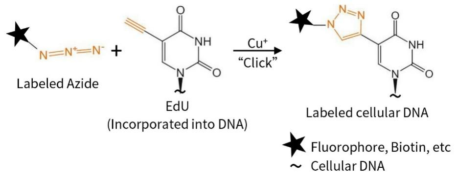 EdU (5-ethynyl-2'-deoxyuridine),中文名为5-乙炔基-2'-脱氧尿苷,是一种新型胸苷(胸腺嘧啶脱氧核苷,thymidine)类似物,EdU可以在DNA合成过程中替代胸苷掺入到新合成的DNA中[1, 2]。另一方面,EdU上的乙炔基能与荧光标记的小分子叠氮化物或吡啶甲基叠氮化物探针(如Azide/Picolyl Azide AF488、AF555、AF594、AF647等)通过一价铜离子的催化发生共价连接反应,形成稳定的三唑环,该反应非常迅速,被称作点击反应(Click reaction),其反应原理参见图1。通过点击反应,新合成的DNA会被相应的荧光探针所标记,从而可以使用适当的荧光检测设备检测到增殖的细胞。