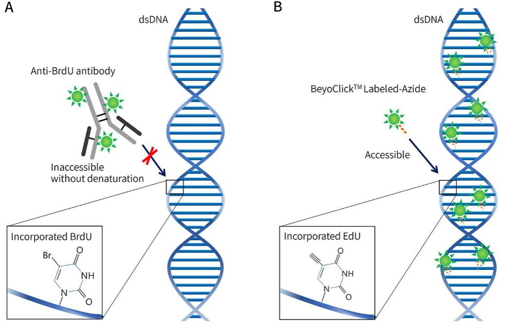 图2.BrdU法和BeyoClick™ EdU法检测原理的比较。A. BrdU法需使用大分子的BrdU抗体,由于空间位阻,双链DNA须变性后才能使BrdU抗体与BrdU结合。B. EdU法使用小分子标记的叠氮化物(Azide),无需DNA变性,操作更便捷,兼容性好,检测结果更加稳定可靠。