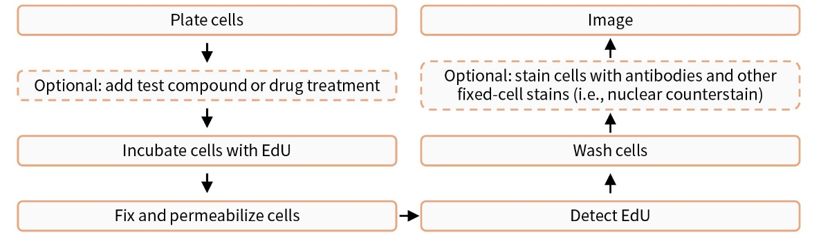细胞增殖能力的检测是评估细胞活性、基因毒性和抗肿瘤药物效果等的基本方法。公认的最精确的检测细胞增殖的方法是直接检测细胞中DNA的合成。最初广泛使用的通过检测DNA合成来检测细胞增殖的方法是放射性标记核苷掺入法,如氚标记胸腺嘧啶脱氧核苷([3H]thymidine)掺入法。但该方法由于有放射性污染并且很难实现单细胞检测而受到很大的限制,随后逐渐被基于抗体检测的BrdU (bromo-deoxyuridine)法所替代。BrdU法步骤繁多,且需要使用BrdU抗体,影响因素较多,稳定性比较差。并且由于BrdU法需要使用抗体,有时会和其它目的蛋白基于抗体的检测相互产生干扰。EdU法基于EdU掺入和后续的点击反应,无需使用抗体、操作便捷、检测灵敏度高,是一种在BrdU法基础上升级换代的新方法,将会逐步取代BrdU法。