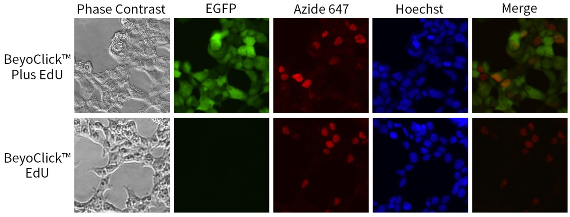 图4.碧云天BeyoClick™ Plus EdU-647细胞增殖检测试剂盒(C0082)和BeyoClick™ EdU-647细胞增殖检测试剂盒(C0081)用于293T细胞增殖检测的效果图。293T细胞中稳定表达了EGFP,细胞显示绿色荧光,加入EdU孵育2小时后被Azide 647标记显示远红荧光(图中红色荧光为伪彩),细胞核进行Hoechst 33342复染后显色蓝色荧光。BeyoClick™ Plus EdU组中的EGFP绿色荧光和Azide 647远红荧光都比较明亮,而BeyoClick™ EdU组中EGFP绿色荧光明显变弱。实测数据可能会因细胞类型、转入的荧光蛋白、检测仪器等的不同而存在差异,图中数据仅供参考。