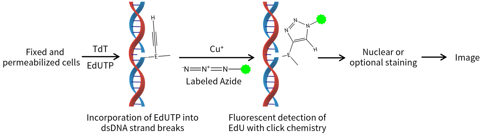 BeyoClick™ TUNEL系列产品使用的是炔基修饰的dUTP (5-Ethynyl-dUTP, EdUTP),炔基中的碳碳三键(-C≡C-)是一种较小的生物正交官能团,它修饰的dUTP比荧光或生物素标记的dUTP更容易通过TdT的催化掺入到断裂DNA上。掺入后,一价铜离子催化荧光探针标记的叠氮化物(Labeled Azide)和炔基发生高特异性点击反应,最终使凋亡细胞标记上相应的荧光[2]。本试剂盒的具体原理参见图1。