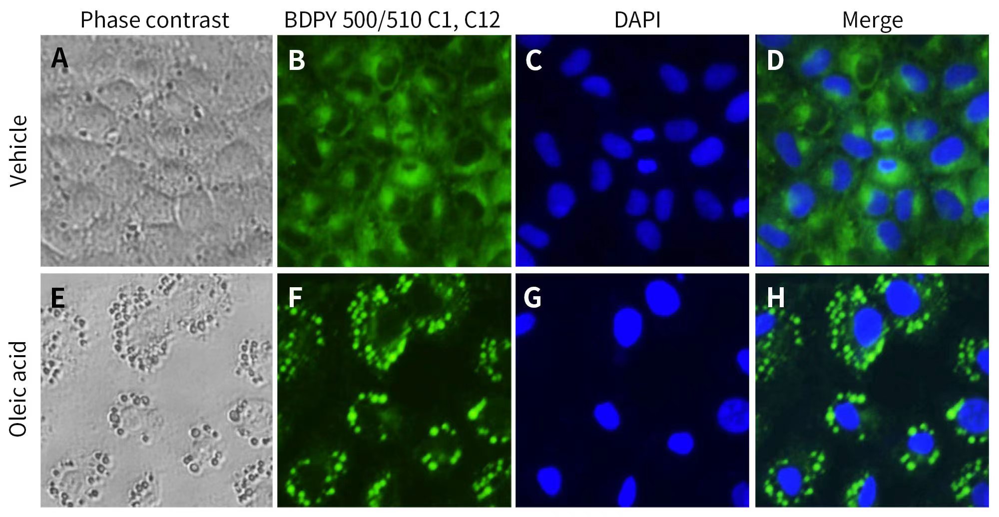 脂类(Lipid),又称脂质,是一类不溶于水而能溶于乙醇、乙醚、氯仿、苯等非极性有机溶剂的化合物。脂类是人体重要的营养素之一,其主要生理功能包括储存和供给能量、提供机体必需脂肪酸、构成细胞膜等膜性细胞组分、以及参与细胞的信号转导等。脂类是脂肪酸与醇脱水缩合生成的酯及其衍生物,动物体内主要包括脂肪(Fats)、磷脂(Phospholipids)和类固醇(Steroids)等。脂质加工和运输缺陷是许多代谢性疾病的基础,脂质代谢异常也是导致肥胖、糖尿病、心血管疾病和癌变的主要因素。通过标记不同链长的脂肪酸,可视化脂肪酸的运输和代谢,可以更好地了解代谢功能[1]。BDPY 500/510 C1, C12常作为荧光探针用于脂肪酸摄取、脂质转运的研究,例如可以溶解在橄榄油中用于小鼠等检测肠道对于脂肪酸的吸收,检测脂肪、肝脏等对于灌胃后脂肪酸的吸收情况,研究血管平滑肌中脂质运输情况,以判断脂毒性在动脉粥样硬化发展中的作用等[2]。