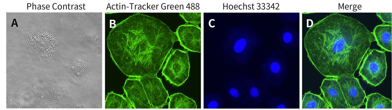 图1.碧云天微丝绿色荧光染色试剂盒(Actin-Tracker Green-488) (C2221)染色NRK-52E (大鼠肾小管上皮细胞)的效果图。经Actin-Tracker Green-488染色的NRK-52E细胞可见绿色细丝状形态微丝(图B),Hoechst 33342染色的NRK-52E细胞的细胞核呈蓝色荧光(图C),微丝绿色荧光和细胞核蓝色荧光的叠加(Merge)效果见图D。本图仅作参考,不同的样品不同的检测条件,实际获得的结果可能有所差别。