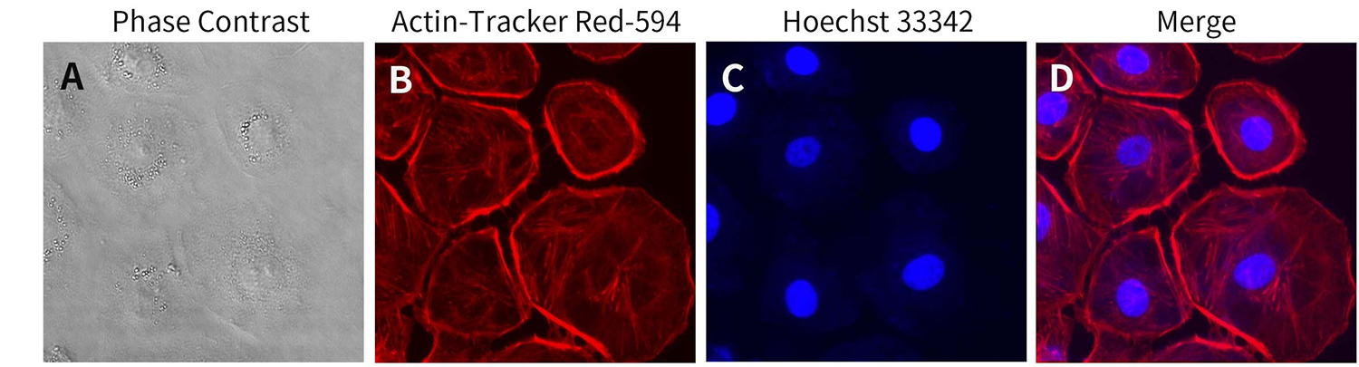 图1.碧云天即用型微丝红色荧光染色液(Actin-Tracker Red-594) (C2237)染色NRK-52E (大鼠肾小管上皮细胞)的效果图。经本产品染色的NRK-52E细胞可见红色细丝状形态微丝(图B),细胞核采用Hoechst 33342染色(图C),微丝红色荧光和细胞核蓝色荧光的叠加(Merge)效果见图D。本图仅作参考,不同的样品不同的检测条件,实际获得的结果可能有所差别。
