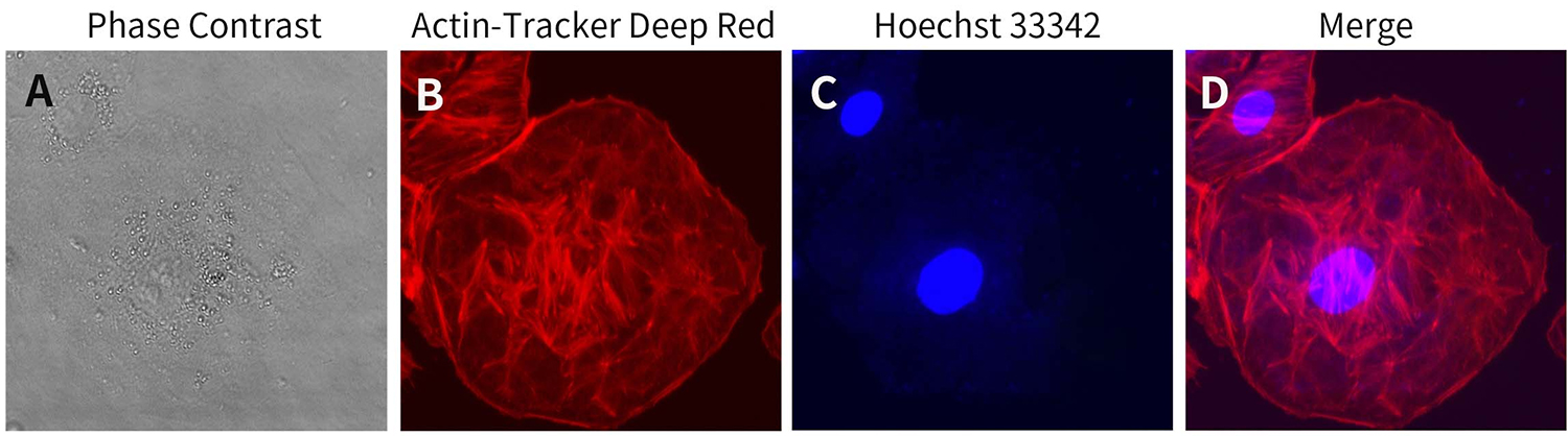 图1.碧云天即用型微丝深红色荧光染色液(Actin-Tracker Deep Red-633) (C2241)染色NRK-52E (大鼠肾小管上皮细胞)的效果图。经本产品染色的NRK-52E细胞可见红色细丝状形态微丝(图B),细胞核采用Hoechst 33342染色(图C),微丝红色荧光和细胞核蓝色荧光的叠加(Merge)效果见图D。本图仅作参考,不同的样品不同的检测条件,实际获得的结果可能有所差别。