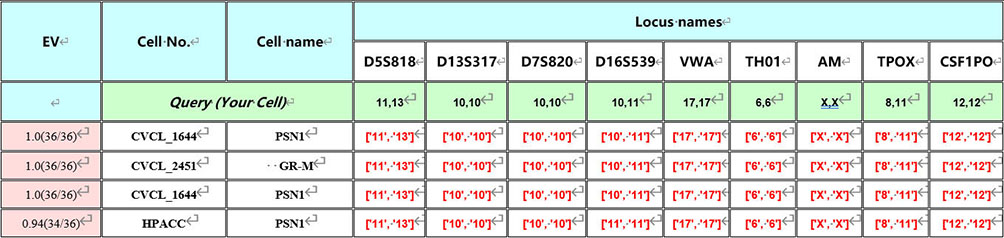 本细胞株通过STR (Short tandem repeats)鉴定,具体结果如下: