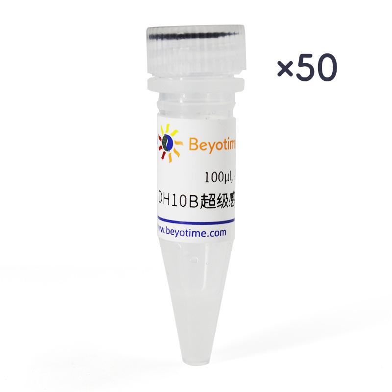 碧云天生产的DH10B超级感受态细胞,英文名DH10B Super Competent Cells,是一种可以用于高效克隆的E. coli DH10B即用型化学感受态细胞。使用pUC19质粒进行热激活转化,在严格按照使用说明进行操作时,转化效率可以达到1.0±0.5×108cfu/μg DNA。