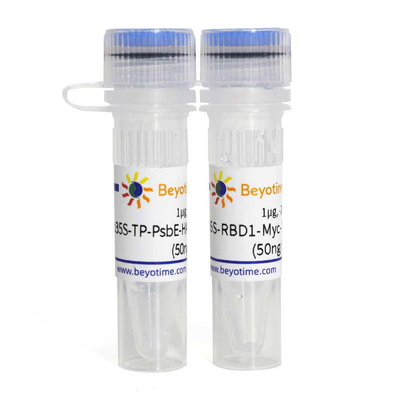 碧云天的HA&Myc标签BiFC阳性对照质粒对(Positive Control Plasmids Pair with HA and Myc Tags for BiFC)包含p35S-TP-PsbE-HA-YFP (156-239aa)和p35S-RBD1-Myc-YFP (1-155aa)两种质粒,可以用于在植物细胞中分别表达C端带有HA标签及YFP (156-239aa)的PsbE、和C端带有Myc标签及YFP (1-155aa)的RBD1融合蛋白。因为RBD1和PsbE蛋白间具有较强的相互作用,本质粒对可作为共转化植物原生质体细胞的双分子荧光互补(Bimolecular fluorescence complementation, BiFC)实验的阳性对照使用。