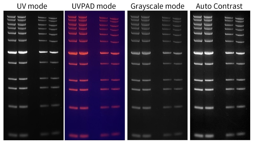 图2.碧云天BeyoImager™ UVPAD LED紫外凝胶透射仪(E6952)的成像效果。UVPAD模式的拍照效果,在通过Photoshop等软件适当调整后,和紫外模式下的拍照效果基本一致或更好。UV mode即紫外模式,为凝胶在紫外条件下(300nm左右波长)成像(专门的凝胶成像系统,曝光时间为600ms);UVPAD mode,为在使用本UVPAD LED紫外凝胶透射仪和智能手机在迷你暗室基础上的成像(亮度最强);Grayscale mode为UV mode的图像通过Photoshop等图像处理软件进行灰度处理后的效果;Auto Contrast为通过Photoshop等图像处理软件在Grayscale mode基础上进行自动对比度调整后的效果。UVPAD mode的效果图也可以直接使用。相关图像处理方式仅供参考。电泳条件:Agarose (Low Melting Point) (ST105)凝胶浓度为1%,NA-Red (EB升级换代产品, 2000X) (D0128/D0130)按1:2000的比例加入到琼脂糖凝胶中;样品为DNA Ladder (0.2-12 kb, 12 bands) (D0110),左侧两个泳道上样量为2μl,右侧两个泳道上样量为1μl;电泳槽为NA-Gel™琼脂糖凝胶配制与电泳系统(E6090),电泳条件为150V、45分钟。实际检测效果会因核酸样品种类和大小、电泳槽、核酸染料、电泳条件和手机或相机等的不同而存在差异,图中数据仅供参考。