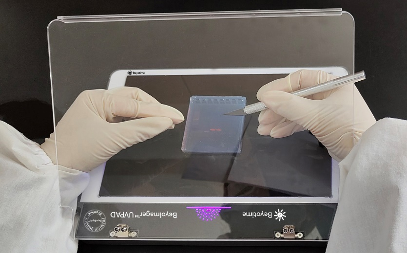 图5.碧云天BeyoImager™ UVPAD LED紫外凝胶透射仪(E6952)在紫外切胶时的操作。