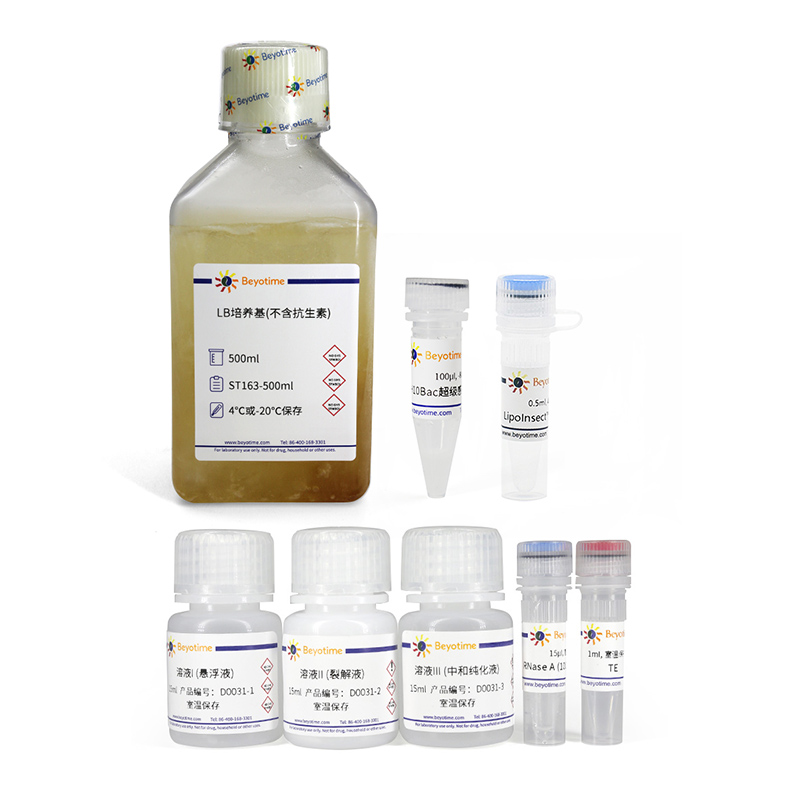 碧云天的昆虫细胞转染福袋提供了用于昆虫细胞转染实验的质粒制备、转染试剂等常用试剂,包括LipoInsect™转染试剂(C0551-0.5ml)、DH10Bac超级感受态细胞(D1029S)、杆状病毒穿梭载体bacmid小量抽提试剂盒(D0031)、LB培养基(不含抗生素)(ST163-500ml)。