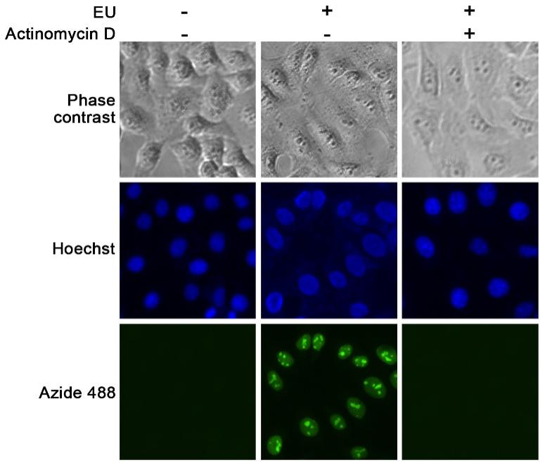 图3. 碧云天BeyoClick™ EU-488 RNA合成检测试剂盒(R0301)检测HeLa细胞新合成RNA的效果图。EU孵育2小时后检测,无EU组观察不到绿色荧光(最左侧一列);EU (1mM)组有较强的绿色荧光(中间一列);而用RNA合成抑制剂Actinomycin D (1μM)提前预处理0.5小时后,绿色荧光显著减弱,说明RNA合成抑制后,EU的掺入被显著抑制(最右侧一列)。实际检测效果会因实验条件、检测仪器等的不同而存在差异,图中效果仅供参考。