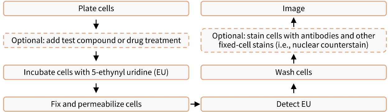 本试剂盒可以检测到活细胞或组织样品中新合成的RNA,而不检测DNA[1]。检测过程中不需要放射性同位素和抗体,只需要简单的两步反应即可完成。