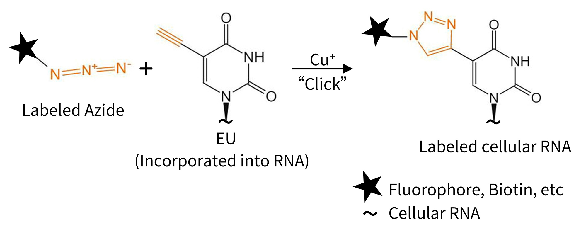 EU (5-ethynyl-uridine),中文名为5-炔基尿苷,是一种新型尿嘧啶核苷(Uridine)类似物,EU可以在RNA合成过程中替代尿苷掺入到新合成的RNA中。另一方面,EU上的乙炔基能与荧光标记的小分子叠氮化物探针(如Azide Alexa Fluor 488、Azide Alexa Fluor 555、Azide Alexa Fluor 594、Azide Alexa Fluor 647等)通过一价铜离子的催化发生共价反应,形成稳定的三唑环,该反应非常迅速高效,被称作点击反应(Click reaction),其反应原理参见图1。通过点击反应,新合成的RNA会被相应的荧光探针所标记,从而可以使用适当的荧光检测设备检测到新合成RNA。