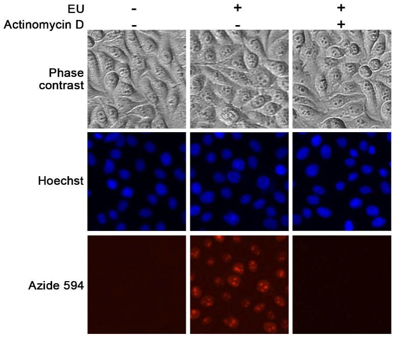 图3.碧云天BeyoClick™ EU-594 RNA合成检测试剂盒(R0309)检测HeLa细胞新合成RNA的效果图。EU孵育2小时后检测,无EU组观察不到红色荧光(最左侧一列);EU (1mM)组有较强的红色荧光(中间一列);而用RNA合成抑制剂Actinomycin D (1μM)提前预处理0.5小时后,红色荧光显著减弱,说明RNA合成抑制后,EU的掺入被显著抑制(最右侧一列)。实际检测效果会因实验条件、检测仪器等的不同而存在差异,图中效果仅供参考。